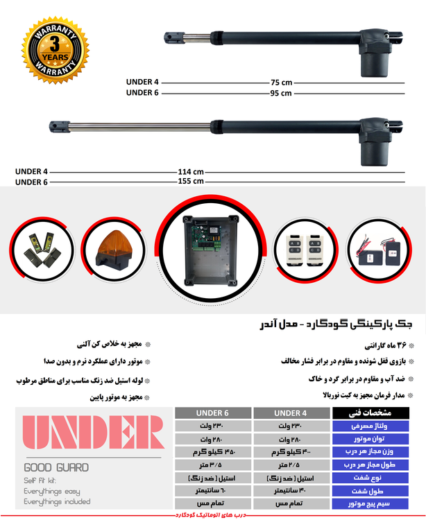 جک پارکینگ گودگارد مدل آندر 4 دارای دو عدد بازو با قابلیت جابجایی هر بازو 2.5 متر و قدرت 400 کیلو برای هر لنگه میباشد ، جک پارکینگ گودگارد محصولی ایرانی با قابلیت های فنی بسیار مناسب برای محیط های مسکونی میباشد از نظر شکل ظاهری این جک درب پارکینگ بسیار شبیه مدل های پروتکو و میلان و بسیاری از جک های پارکینگی دیگر میباشد که از موفق ترین پلت فورم جک استفاده شده است. موتور های این جک 220 ولت بسیار قدرتمند است که قابلیت جابجایی 400 کیلوگرم درب برای هر لنگه و 2.5 متر برای هر لنگه را دارد.