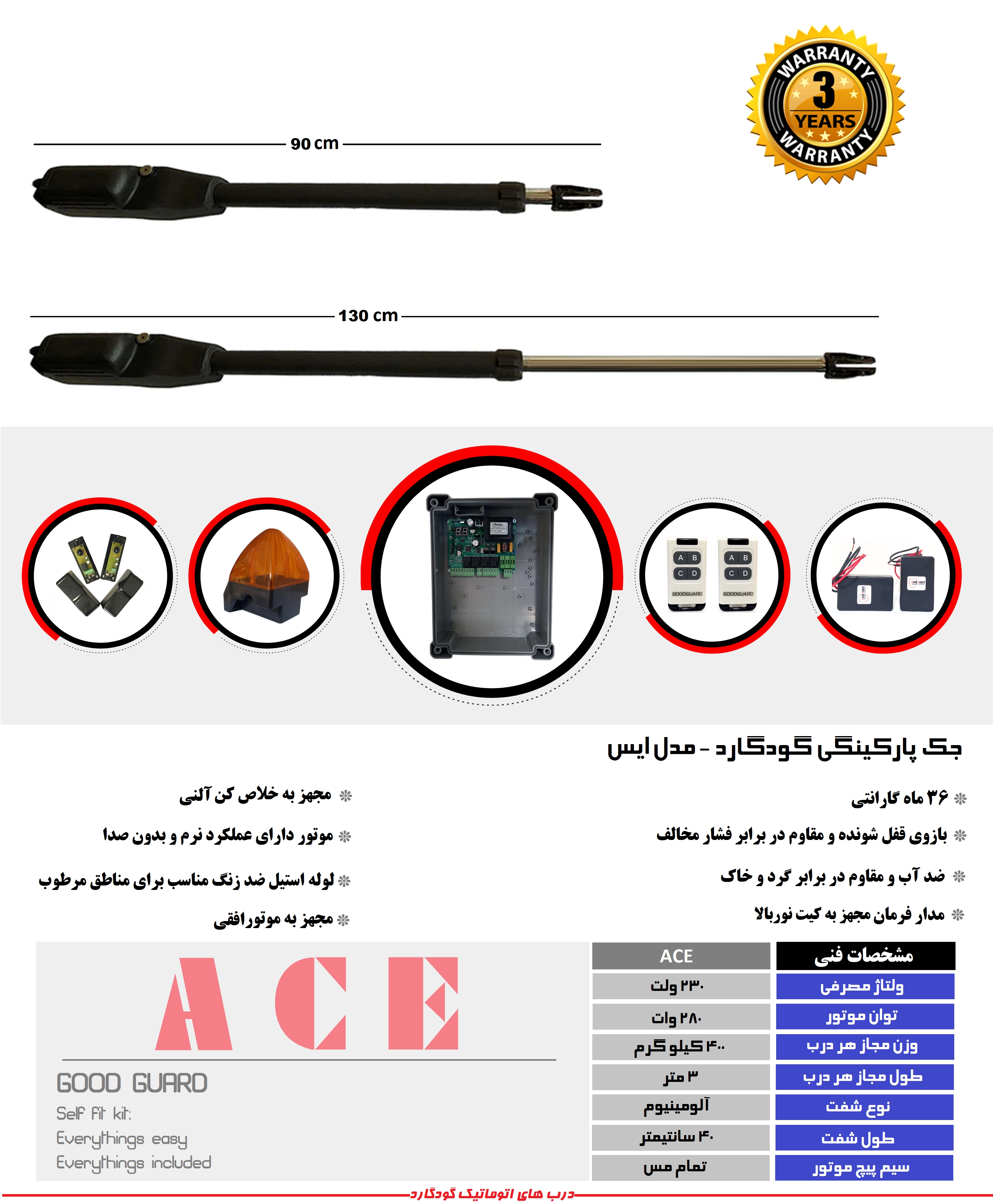 جک پارکینگ گودگارد مدل ایس دارای دو عدد بازو با قابلیت جابجایی هر بازو 3 متر و قدرت 400 کیلو برای هر لنگه میباشد ، جک پارکینگ گودگارد محصولی ایرانی با قابلیت های فنی بسیار مناسب برای محیط های مسکونی میباشد از نظر شکل ظاهری این جک درب پارکینگ بسیار شبیه مدل های پروتکو و میلان و بسیاری از جک های پارکینگی دیگر میباشد که از موفق ترین پلت فورم جک استفاده شده است. موتور های این جک 220 ولت بسیار قدرتمند است که قابلیت جابجایی 400 کیلوگرم درب برای هر لنگه و 3 متر برای هر لنگه را دارد.