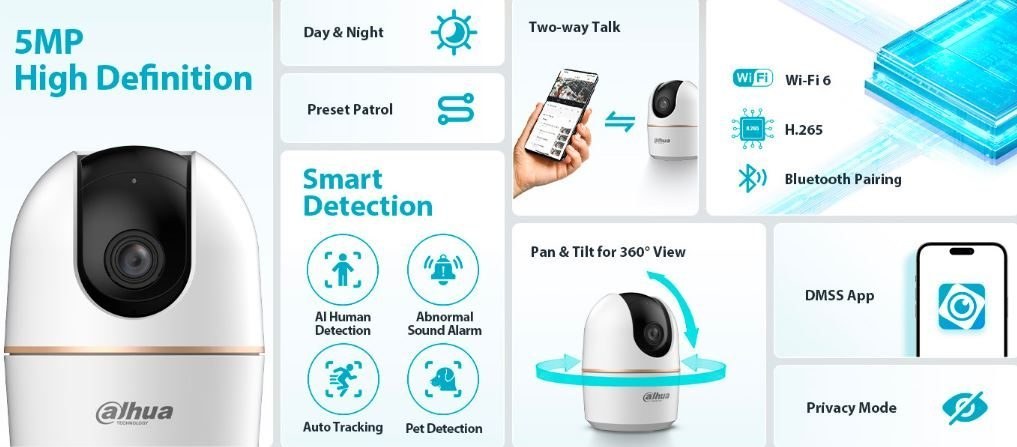 سنسور تصویر: 5 مگاپیکسل 1/3 اینچی CMOS کیفیت تصویر: 1620 × 2880 پیکسل تکنولوژی فشره سازی و ضبط: H.265 دید در شب: مادون قرمز تا برد 10 متر نوع لنز: ثابت 3.6 میلی متری زاویه دید: 88 درجه جنس بدنه: پلاستیک استاندارد حفاظتی: IP65 مقاوم در برابر نفوذ آب و گرد و غبار قابلیت ضبط صدا: دارای میکروفن و بلندگو داخلی جهت مکالمه دو طرفه ساپورت کارت حافظه: رم میکرو اس دی تا ظرفیت 256 گیگابایت چرخش دوربین: 355 درجه افقی و 80 درجه عمودی انتقال تصویر: رایگان P2P – نرم افزار DMSS نوع اتصال: وای فای Wi-Fi نوع تغذیه: DC 5V-1A